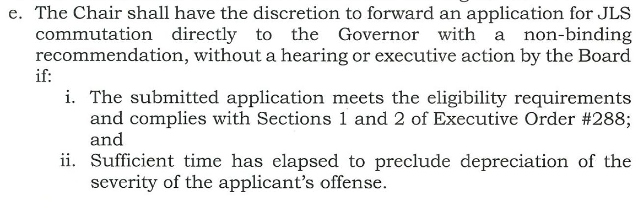 However, Executive Order 287 introduces something critical: a second track. Under its recommendations section, the board’s chair has discretion to forward an application directly to the governor without a hearing if eligibility requirements are satisfied and sufficient time has elapsed relative to the offense. This mechanism is not unprecedented. A similar shortcut was introduced in Executive Order 130 in 2021 for pardons. Its purpose is straightforward—it addresses the constraint of time. The application materials themselves acknowledge that a full review, including background checks, institutional records, and consultation with stakeholders, may take over a year. That timeline exceeds the lifespan of the current advisory structure. What emerges, then, is a triage system in which some cases move through full board review, others are expedited through the chair-forward shortcut, and a significant number may remain unresolved before the committee sunsets. This is not a flaw; it is a signal about how the administration intends to operate within the time available.