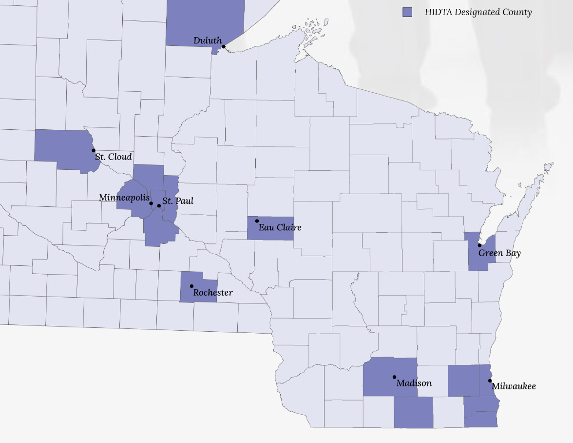 In Wisconsin, HIDTA designations follow a predictable pattern. They appear in counties that sit astride major transportation corridors or industrial hubs: Milwaukee County, Racine County, Kenosha County, Rock County, Dane County, Brown County, and Eau Claire County. Look at a map and the logic becomes obvious. Interstate 94 cuts through Eau Claire, Dane, and Milwaukee. Interstate 90 runs through Dane and Rock Counties into Illinois. Highway 29 crosses Brown County toward northeastern Wisconsin. These corridors connect Minnesota to Illinois, and from Hennepin and Ramsey Counties all the way down to Cook County, Illinois, the Midwest’s major thoroughfares are effectively locked down by overlapping, multijurisdictional drug task forces.