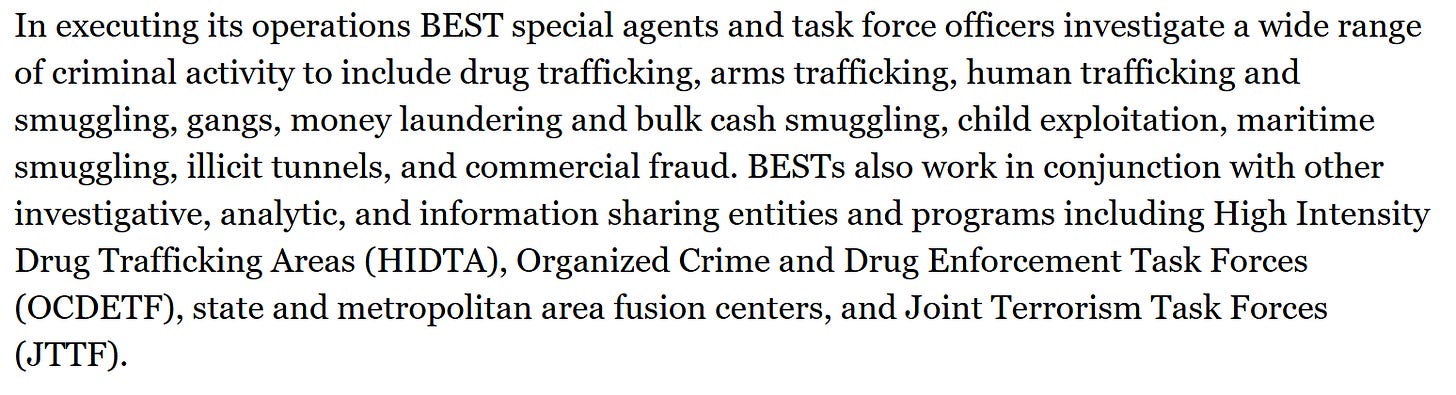 This is where the connection to federal enforcement becomes unavoidable. On the Department of Homeland Security’s own materials, Border Enforcement Security Task Forces (BEST) are described as collaborating with HIDTA regions. ICE and Border Patrol do not operate in an informational vacuum. They rely on the same intelligence streams generated through drug enforcement, gang databases, and multijurisdictional task forces. When federal agents deploy into neighborhoods with confidence, it is because the groundwork has already been laid through years of data collection.